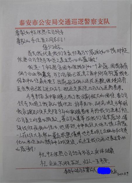 泰安市交警支隊(duì)一位家有兩個(gè)重病患者的職工深處困境,我公司得知其情況后,免除了該職工家今年冬季的采暖費(fèi),并在全公司進(jìn)行一次獻(xiàn)愛(ài)心捐款活動(dòng)。